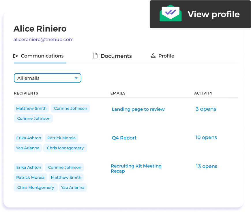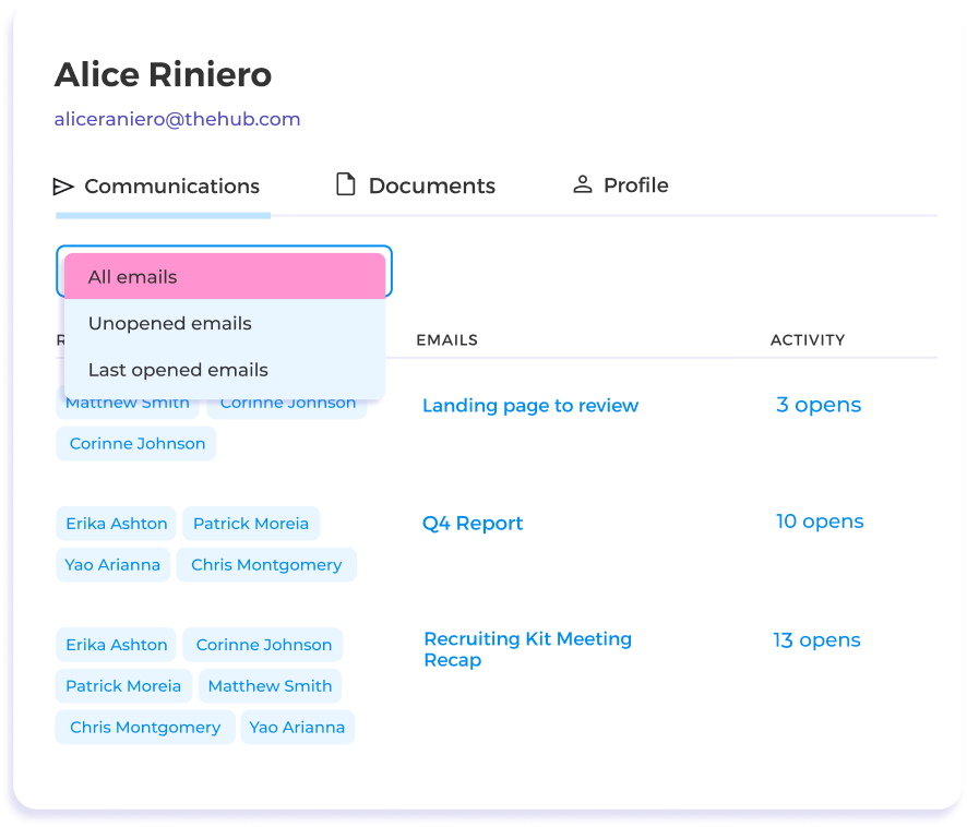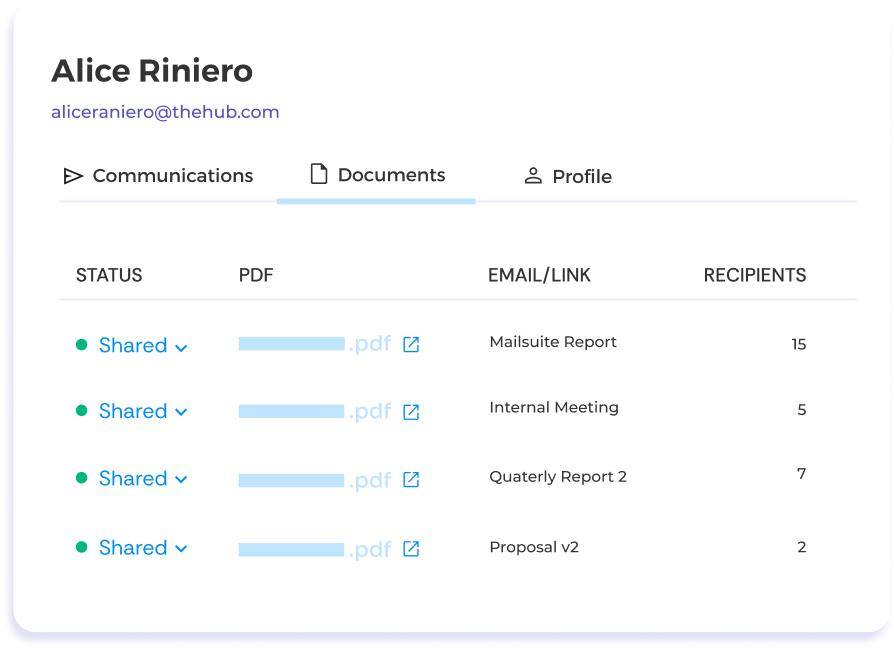 Eliminate manual input—all your data is automatically organized by client. Your incoming and outgoing emails, documents, tracking, and engagement data are automatically logged into the CRM. Spend less time on data entry and more on building relationships.