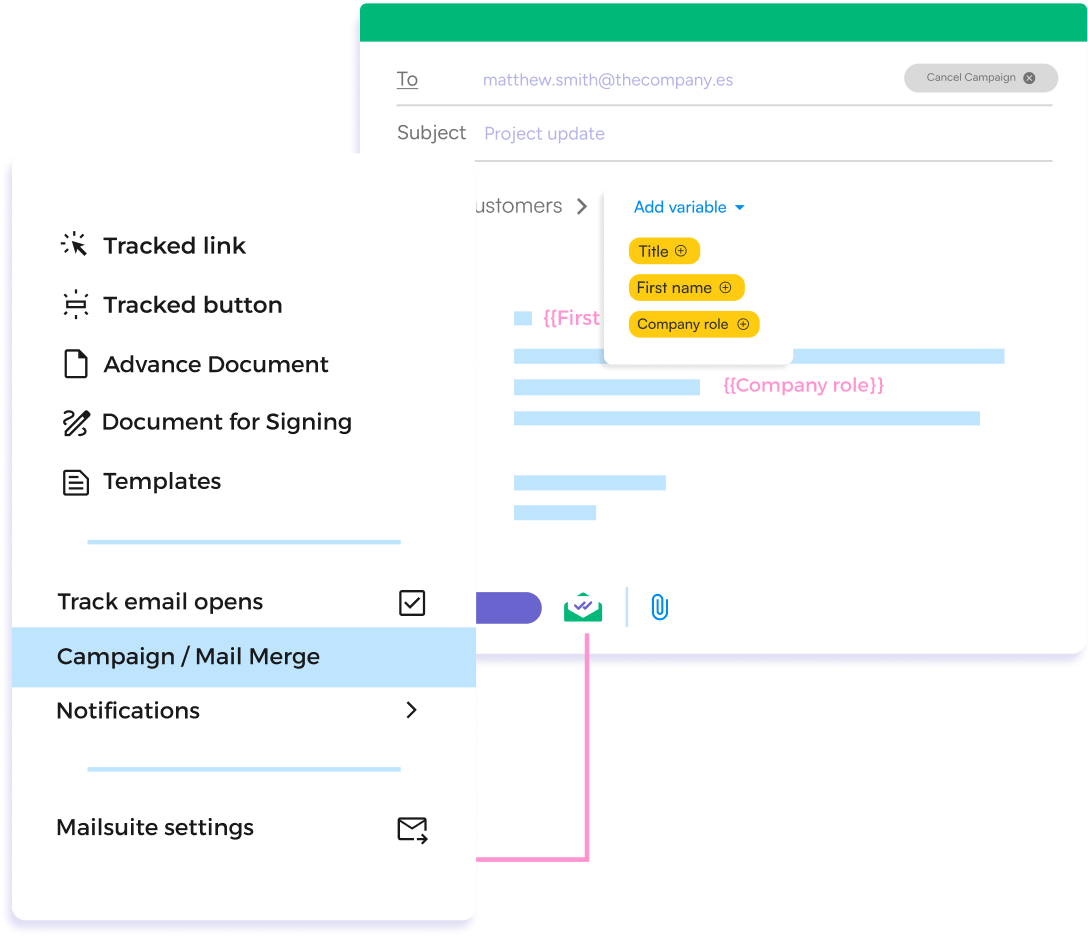 Write an eye-catching subject line and a useful message to engage with your contacts. You can personalize both with Mailsuite.
