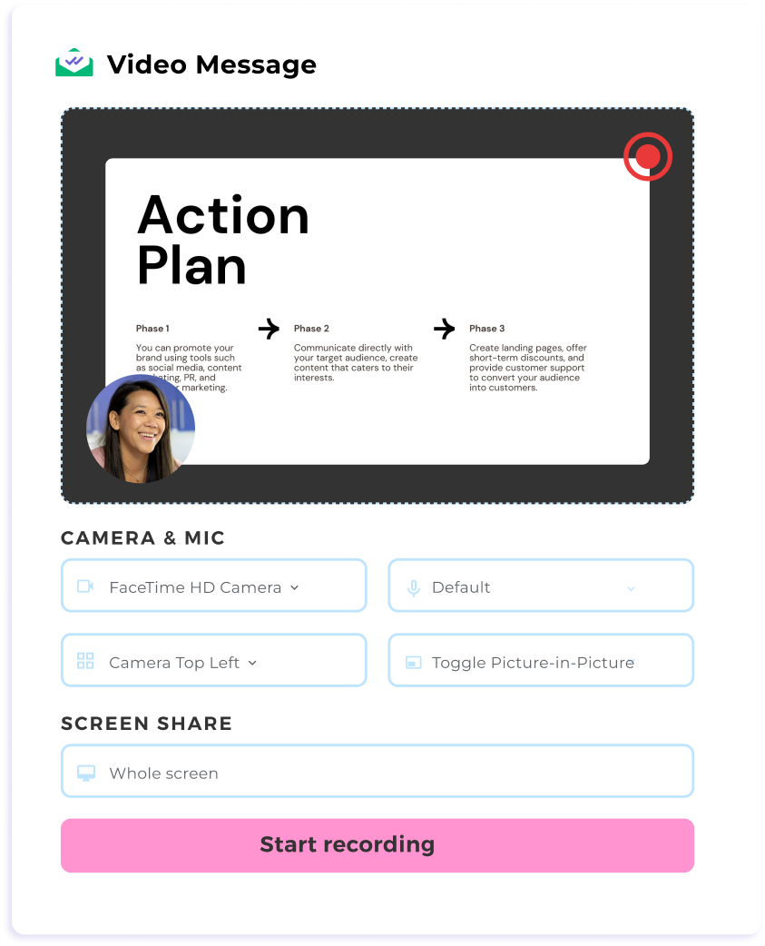 Stop writing long, back-and-forth emails. Instead, use video and screen sharing to walk clients through proposals, demos, or reports quickly– all without leaving Gmail. It's faster, clearer, and more efficient for everyone. No need for external tools to record your videos. Simply send them directly from your inbox.