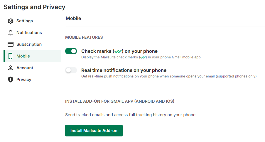 You can get Mailsuite for Gmail check marks to appear in your list of emails and as part of each email thread. If you’re viewing your inbox in a browser, the Mailsuite checkmarks are green. If you’re viewing your inbox in the Gmail app, the checkmarks are gray.