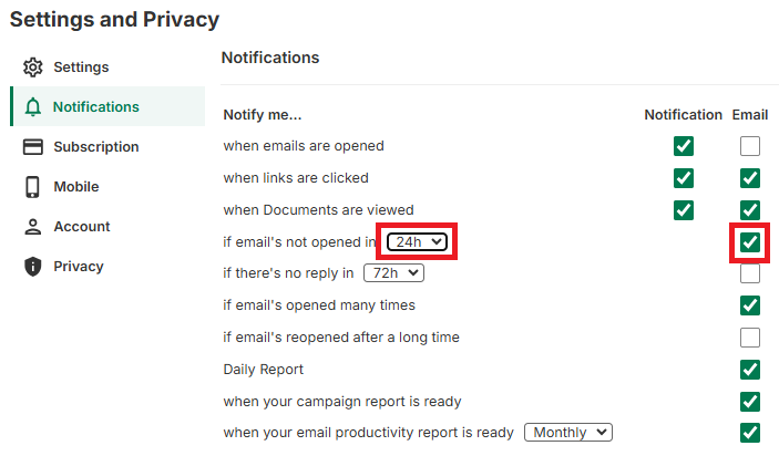 On this screen, you can check or uncheck the boxes to enable or disable each type of notification or reminder. To enable “not opened” reminders, choose your desired time in the dropdown next to if email’s not opened in and check the box in the Email column.