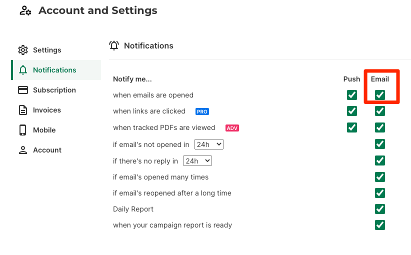 You can enable or disable each alert type in your Mailsuite Dashboard. Click Settings and Privacy > Notifications.