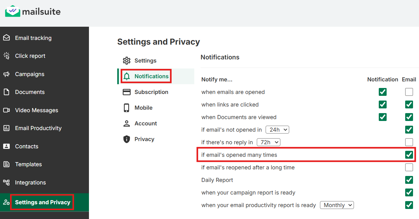 Mailsuite allows you to enable different alerts types so you can stay up-to-date on how recipients interact with your emails. These alert types include: