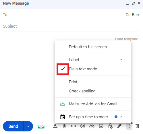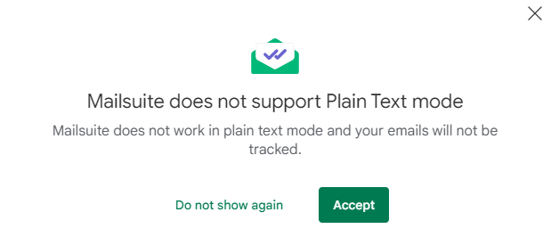 A Plain Text email is an email that only includes text. It does not include images or graphics, links or URLs, HTML coding, or any other formatting. Since our tracking is image-based, you will not be able to use Mailsuite for Gmail in Plain Text mode. Plain Text mode strips all formatting and images, thus disabling Mailsuite’s tracking pixel. For this reason, you must use rich text formatting in Gmail instead of plain text formatting.