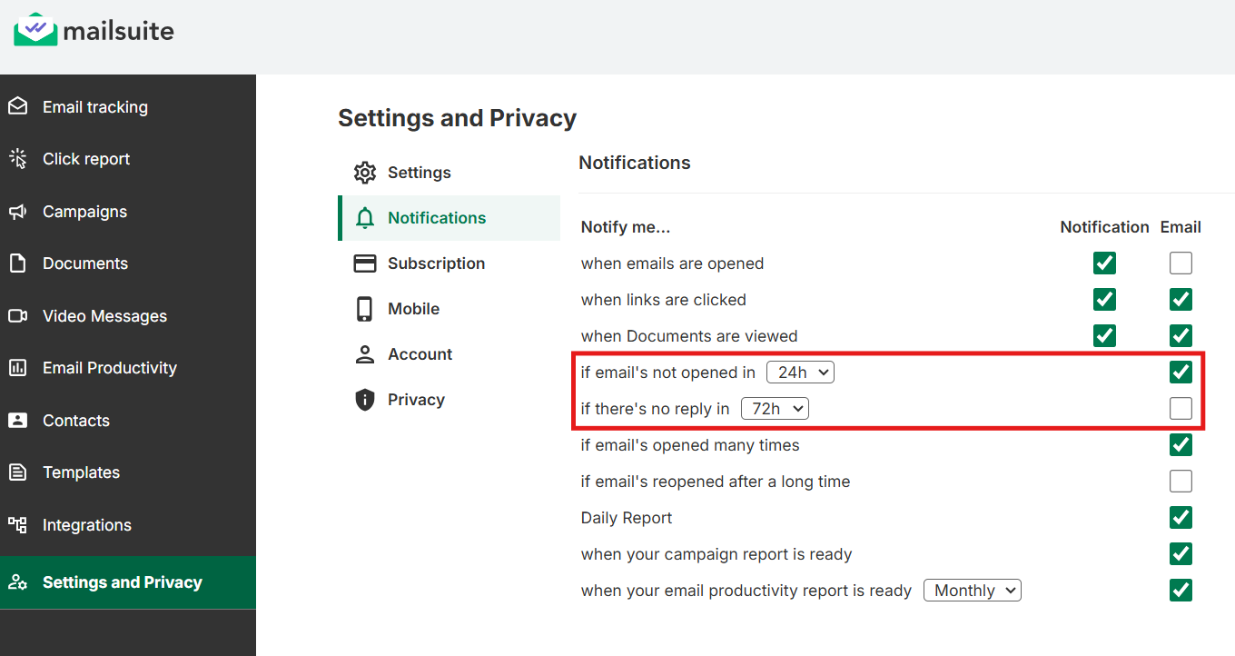 You can enable or disable any type of notification or alert in your Mailsuite Dashboard.