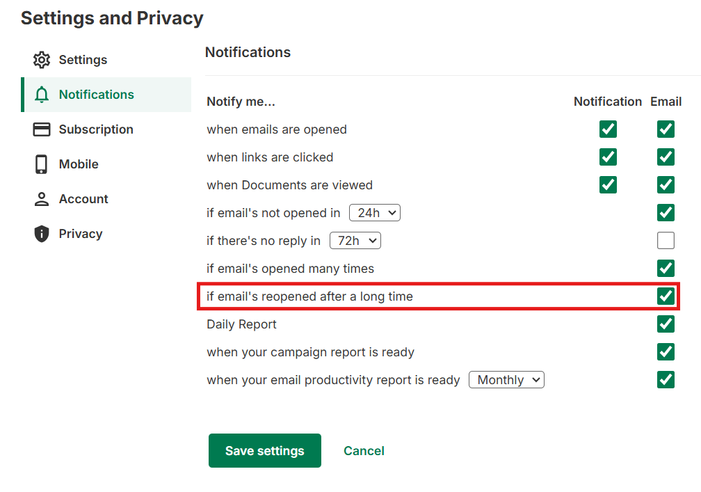 - Check the box next to if email’s reopened after a long time.