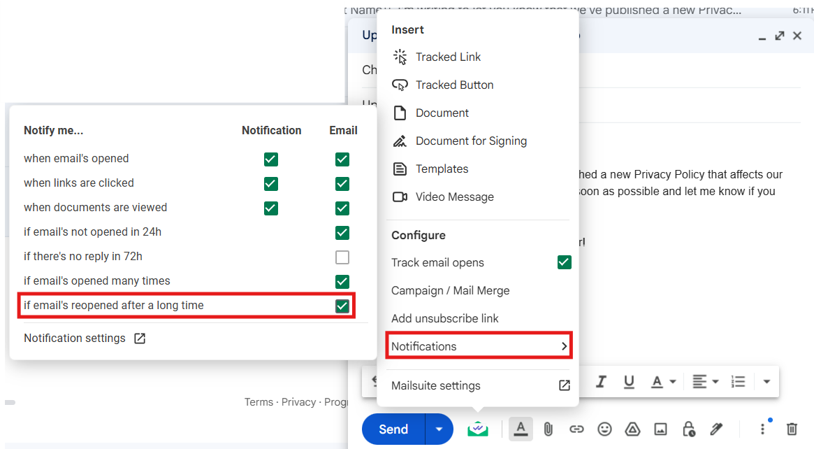 There are two ways to enable email open notifications: from your Mailsuite Dashboard or directly in your Gmail inbox.