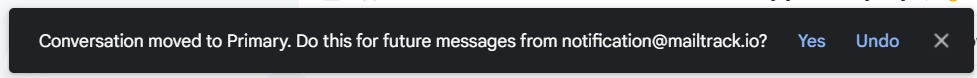 - Then a pop-up will appear confirming that the email alert was moved to your Primary tab. To move all future email alerts from Mailsuite to your Primary tab, click Yes.