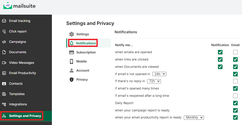 - Go to your Mailsuite Dashboard, then click Settings and Privacy > Notifications