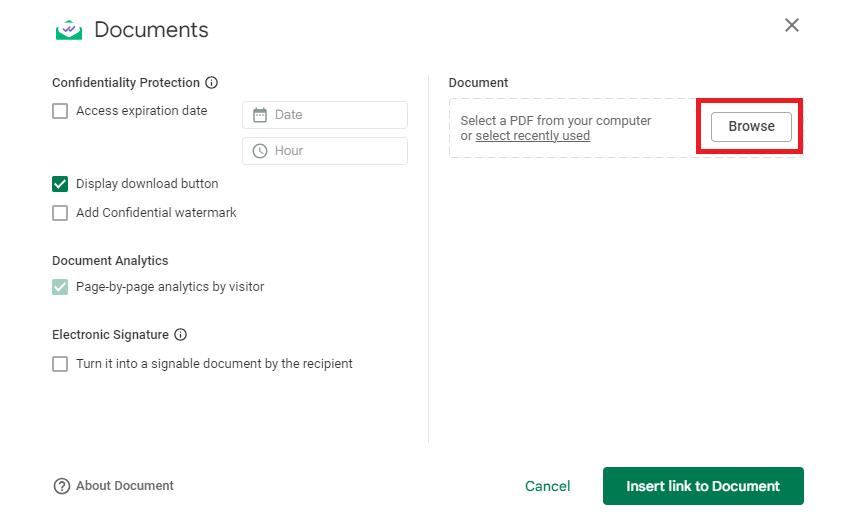 6. After that, click Insert link to Document. This will insert a document link in the body of your email. It’s important to note that the file needs to be sent as a link. If you attach the file without completing the steps above, Mailsuite won’t be able to track when it’s opened.