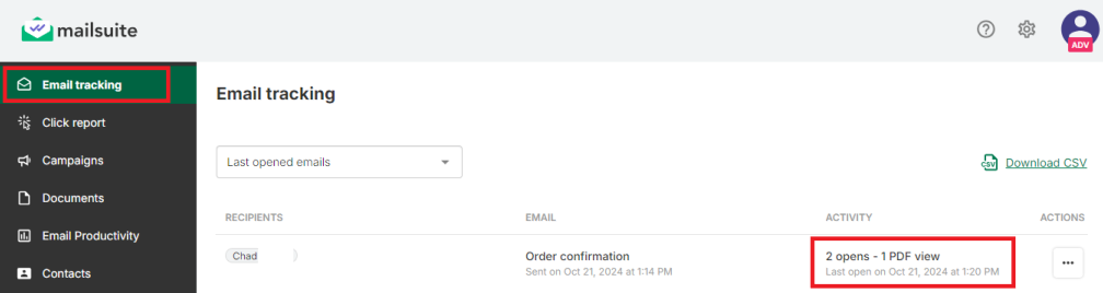 After you send your email, tracking data for both the email itself and your PDF document will be available in your Mailsuite Dashboard. You can also opt to receive email notifications when your email and/or your document are opened.