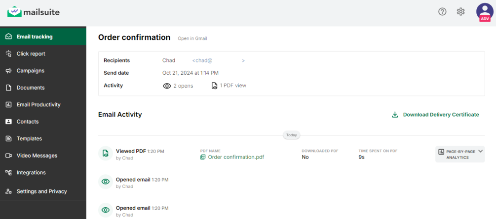 You can then click on the email to view more detailed tracking data, including when the email was open, when the document was viewed, if it was downloaded, how much time the recipient spent reading the document, and page-by-page analytics.