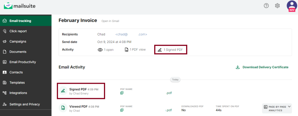 In your Mailsuite dashboard, the signing will also be recorded in the tracking activity for the email that was sent with the signable tracked PDF.