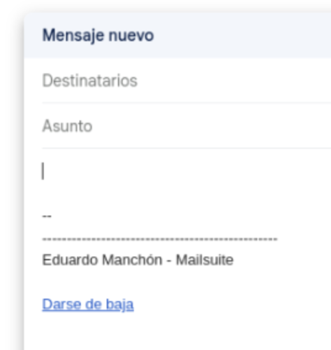 Inmediatamente después de registrarse, Mailsuite incluye por defecto un enlace de darse de baja en la firma de todos los correos electrónicos enviados. Esta función simplifica el proceso para que los destinatarios puedan retirar su consentimiento, asegurando el cumplimiento con los requisitos del RGPD.